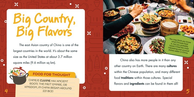 China has given the world dim sum, spring rolls, Peking duck, and many more delicious dishes. The variety of food is a testament to the multifaceted culture of this ancient nation. The age-appropriate main text, augmented with vivid full-color photographs and engaging fact boxes, makes Chinese cuisine accessible to children and instills a deep appreciation for the culinary heritage that has captivated taste buds for generations. An easy-to-follow recipe allows readers to bring a bit of Chinese culture off the page and into their hands.