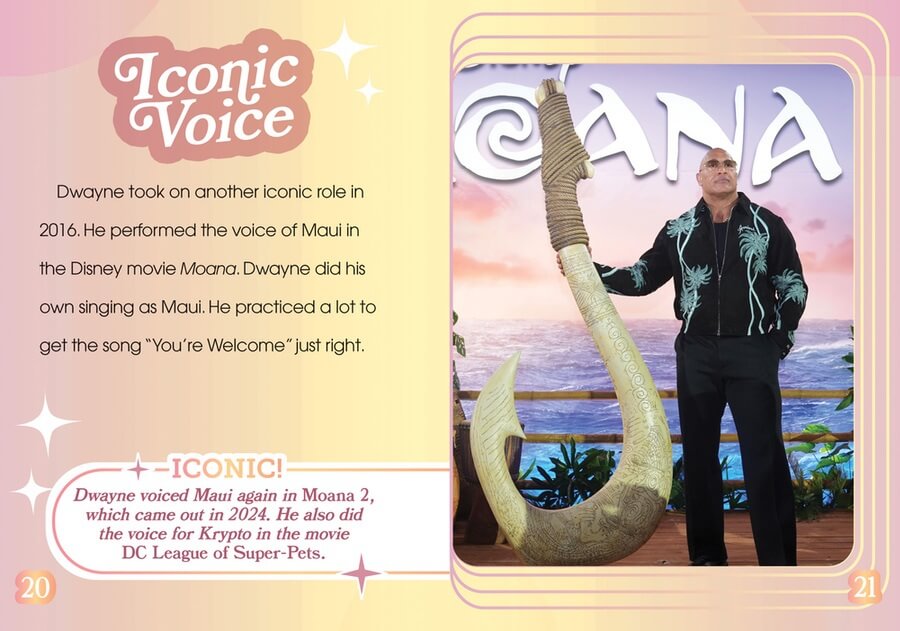From the professional wrestling ring to the big screen, Dwayne “The Rock” Johnson has conquered it all! His successful transition from the squared circle to the wider world of entertainment is a path many have tried to repeat—and failed. He is truly an icon! In this book, readers find out about Dwayne's family connection to wrestling and when he started branching out into acting. The main text highlights his major career accomplishments as well as struggles he faced in his path to stardom.