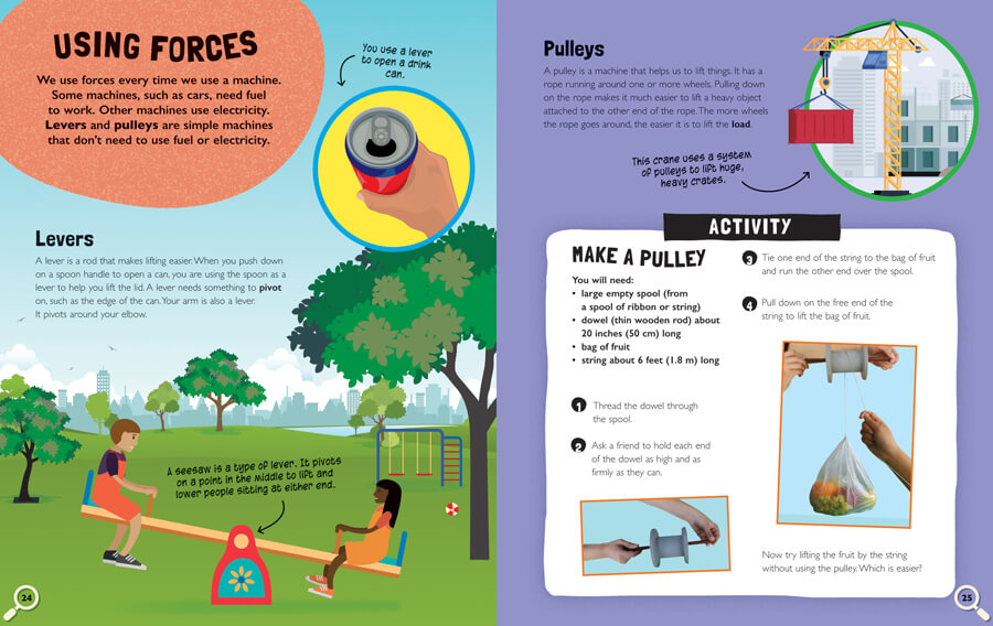 Forces—those that push and pull on objects—are a critical concept in the elementary science classroom. For learners to truly understand this physics topic, they need to see forces in action. This well-designed book takes an up-close look at forces, exploring essential themes such as gravity, magnetism, and friction, through at-level and engaging text that leads into a related high-interest activity, such as making balloon rockets and hovercrafts as well as testing whether objects sink or float. Colorful images accompany both the main information and the step-by-step instructions.