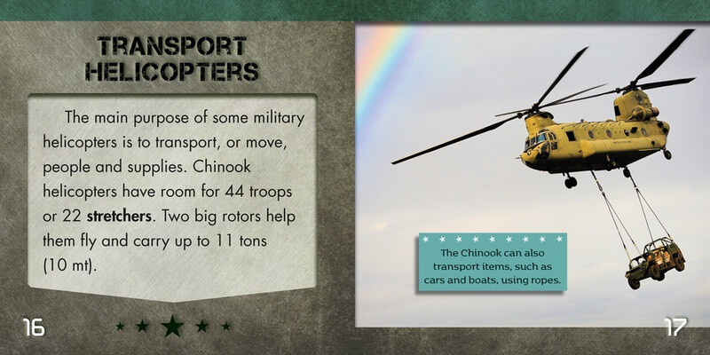 Unlike an airplane, a helicopter can move in all directions and hover in place with the help of its rotors. These abilities make helicopters useful tools for multiple branches of the military. In this introduction to military helicopters, young readers find an overview of the history of helicopters and a survey of the most popular types used to transport troops and cargo. With full-color photographs and a diagram of a helicopter, this book gives readers a new understanding of the mighty role this machine plays in the military.