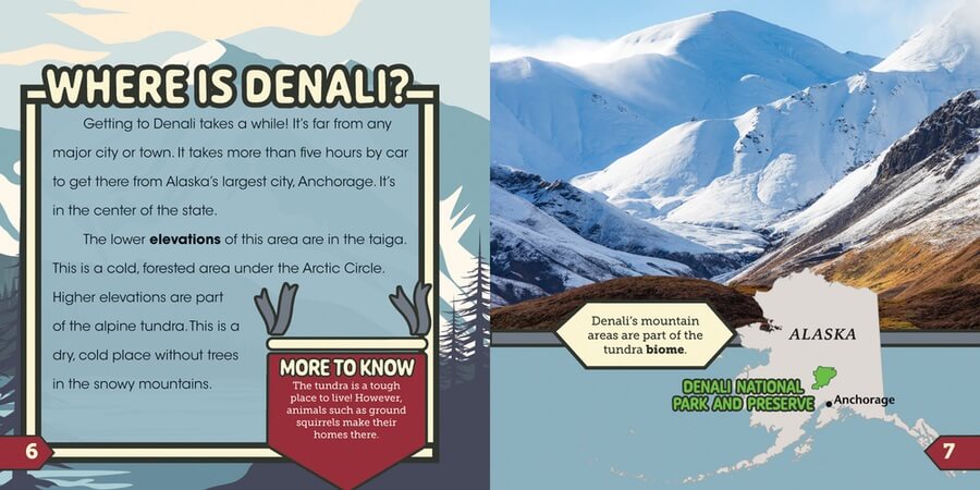 Denali is the tallest peak in North America. But that's not all this national park has to offer. There are millions of acres to view, wild animals to spot, and more to explore. Even though this park is in Alaska, it's open in the winter for fun like snowshoeing, skiing, and biking. Readers find out how this huge area of land was set aside as a national park and preserve in this book, complete with full-color photographs of its majestic landscape. Fact boxes add even more information to aid knowledge building, a key component of the science of reading.